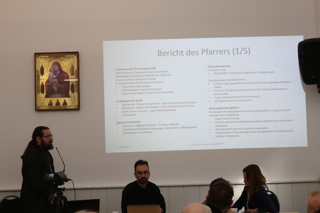 Der Gemeindevorsteher Priester Alexej Veselov stellte seinen Bericht über die Tätigkeit als Gemeindepfarrer vor. Folgende Punkte wurden darin genannt und detailliert ausgeführt: